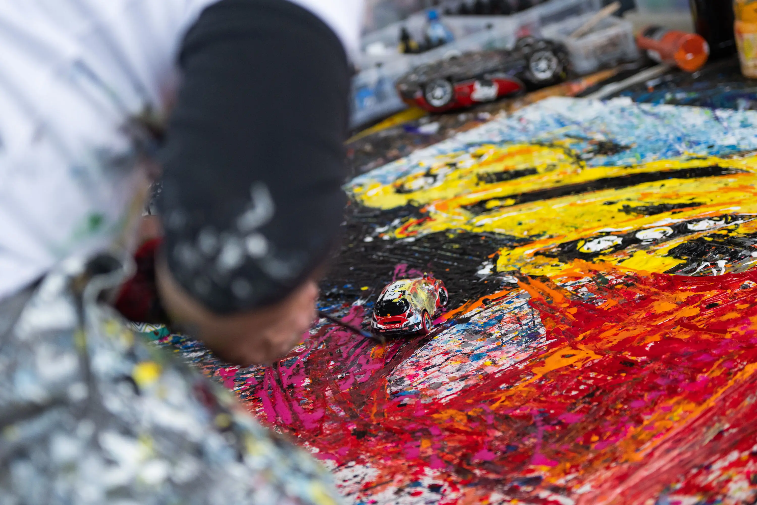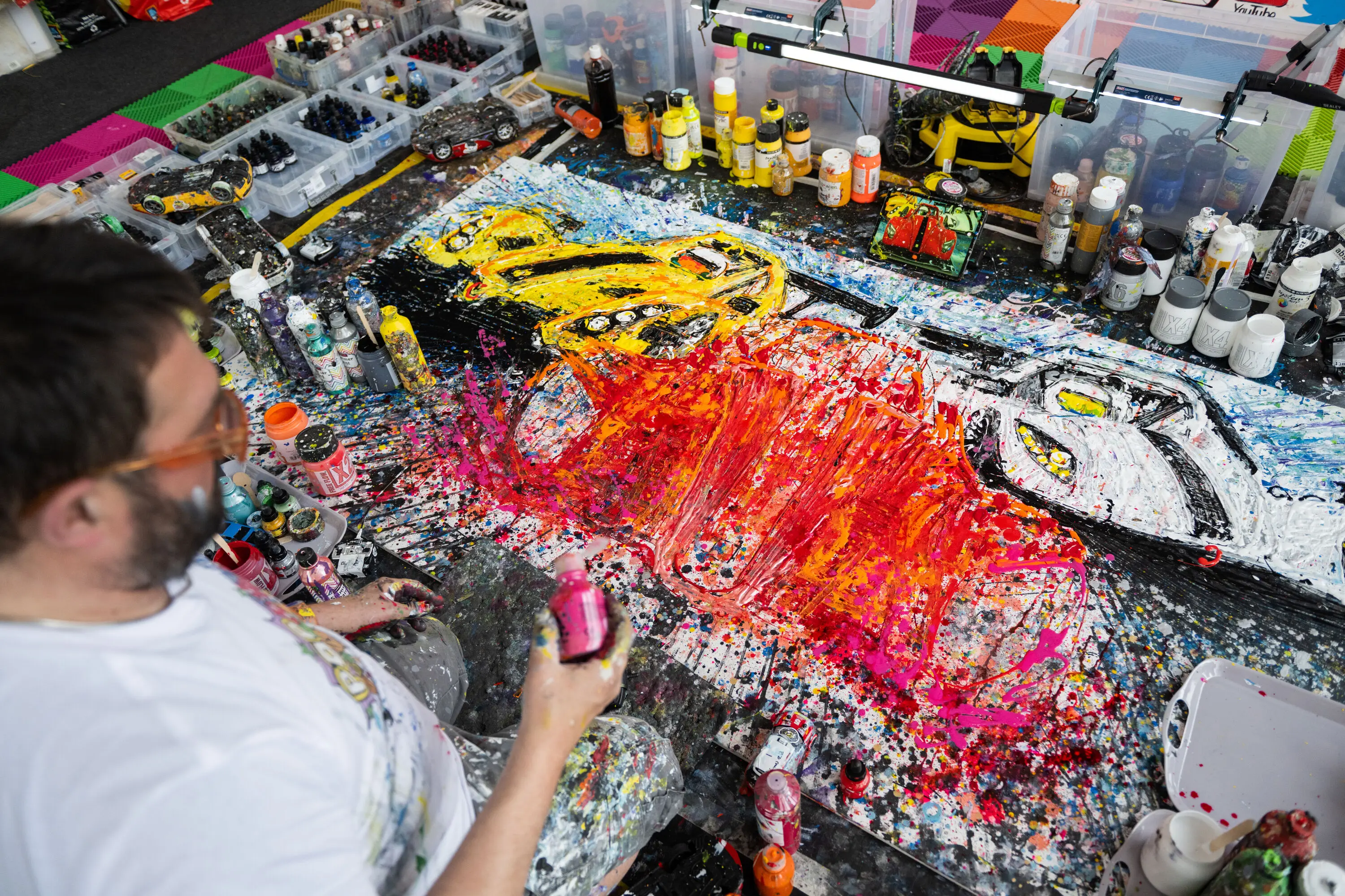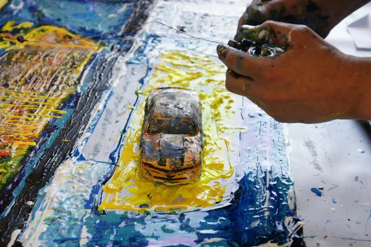 Ian Cook, the creative force behind Popbangcolour, is internationally acclaimed for his distinctive painting style, which involves using remote-controlled cars, car tires, and toy car wheels as paintbrushes. His innovative approach and passion for cars have led to collaborations with major automotive brands and appearances at prestigious events worldwide.